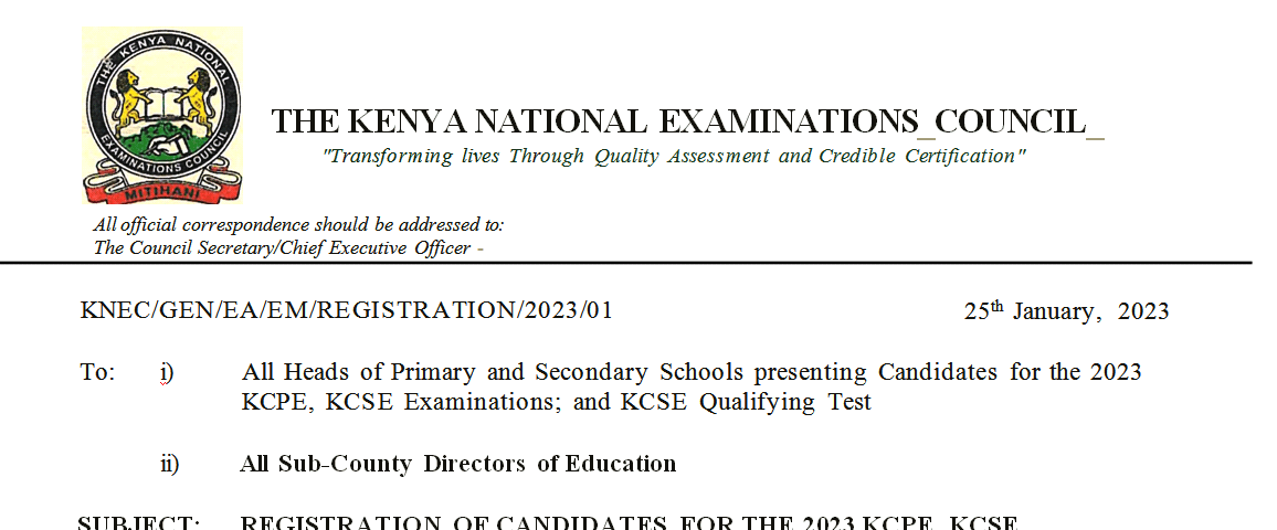 SUBJECT: REGISTRATION OF CANDIDATES FOR THE 2023 KCPE, KCSE EXAMINATIONS; AND KCSE QUALIFYING TEST