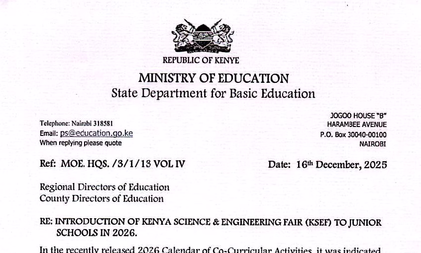 RE: INTRODUCTION OF KENYA SCIENCE & ENGINEERING FAIR (KSEF) TO JUNIOR SCHOOLS IN 2026.