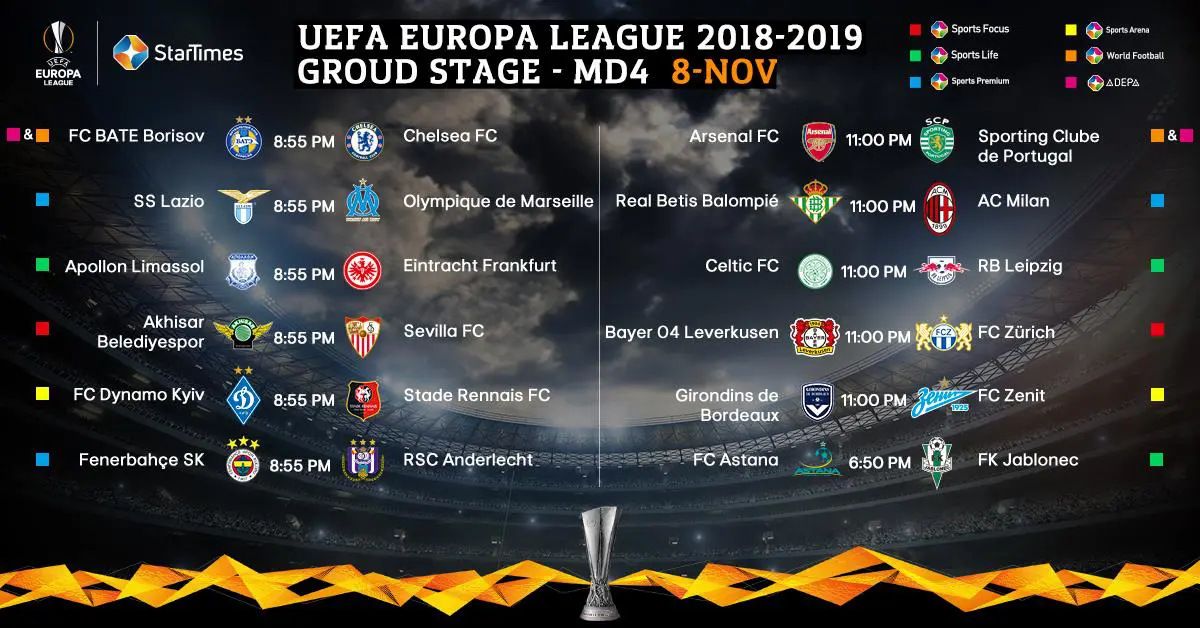 UEFA Europa League Fixtures & TV Schedules for Thursday, 8th November 2018October 5, 2025 Hillary Kangwana Here are today’s Europa League fixtures and TV Schedules for tonight’s matches: Tagged with Where to stream UEFA League matchesSports